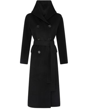 S Max Mara's Favola long belted coat showcases a timeless double-breasted design with three buttons, offering elegance and sophistication. The hood adds practicality, while two front flap pockets provide convenience. With an appliquéd logo at the back, this long-sleeved coat is the perfect blend of classic style and modern functionality.