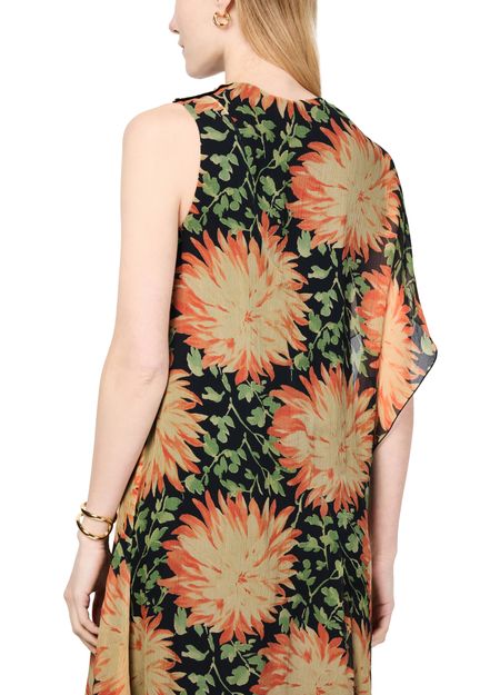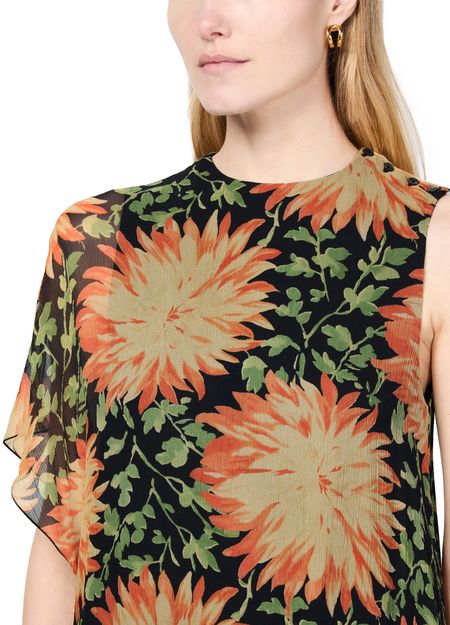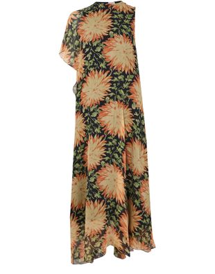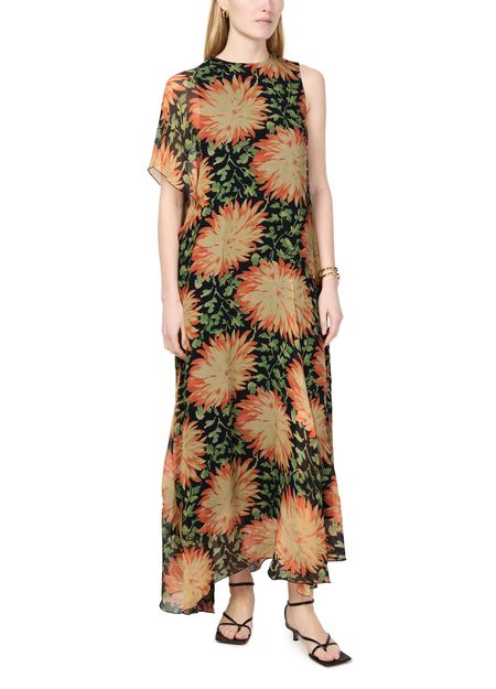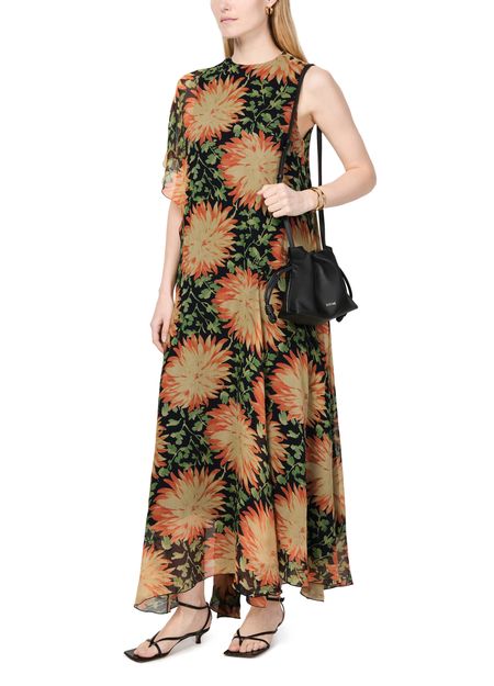 Loewe's floral print flowing dress showcases a short-sleeved design with a crew neck, perfect for warm days. This maxi dress features a flared silhouette that dances with every step, while the visible stitching adds a touch of artisanal charm. Embrace effortless elegance and let your style bloom.