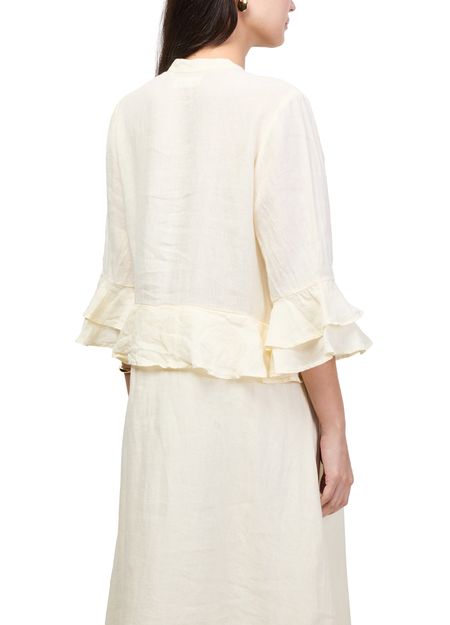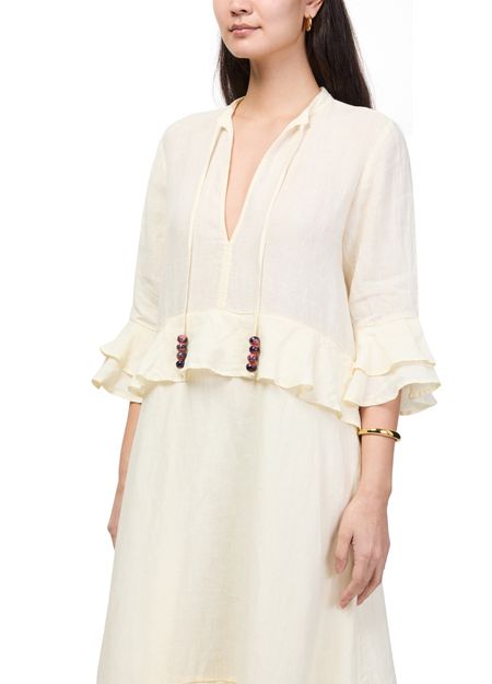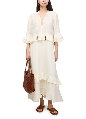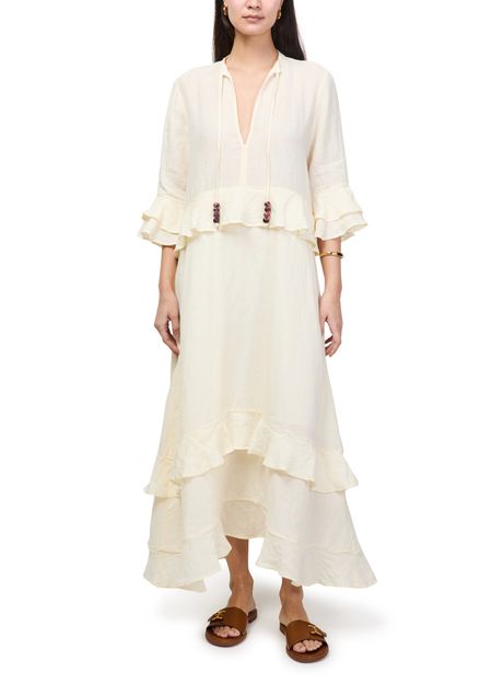 Reveal Skall Studio's Frigga maxi dress, a refined statement with a flowing silhouette. The V-neck and three-quarter ruffled sleeves add a graceful touch, while delicate ruffle details enhance its modern appeal. Perfect for elevating your day-to-evening wardrobe with effortless sophistication.
