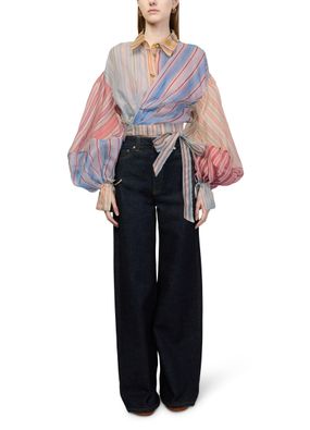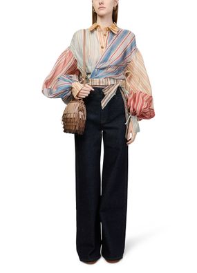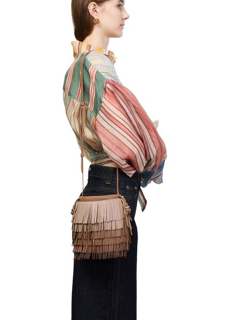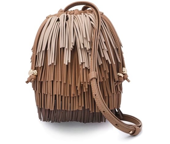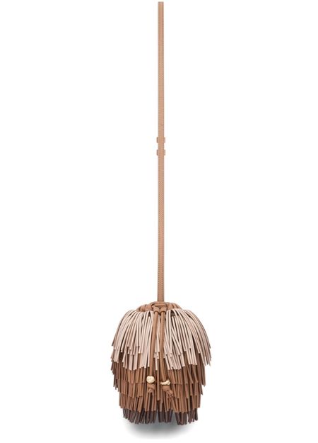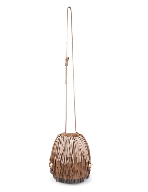 Reveal Zimmermann's fringed shoulder bag, crafted from smooth leather with a refined silhouette. The adjustable thin strap and drawstring closure offer both style and practicality, while visible topstitching and fringe details add a distinctive, modern edge to this standout accessory.