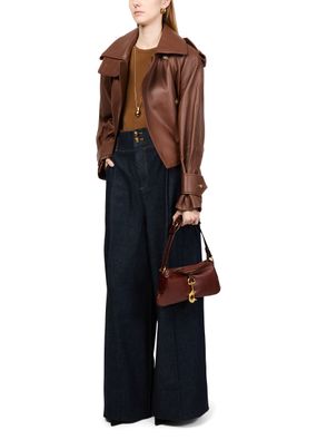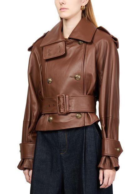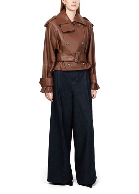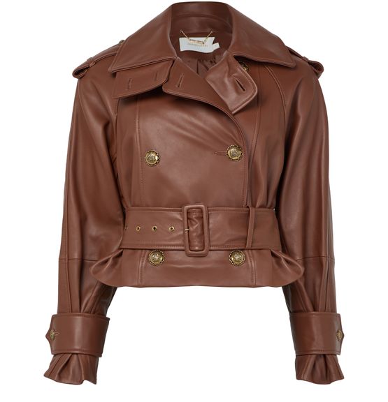 Reveal Zimmermann's casual jacket, a regular fit crafted from smooth leather. This cropped piece features a button fastening and long sleeves, adorned with embellished buttons and ruffle details. Perfect for versatile styling, it effortlessly transitions from casual to more formal occasions.
