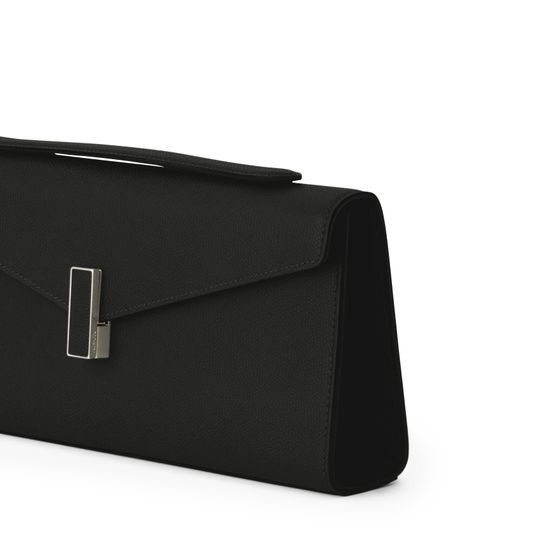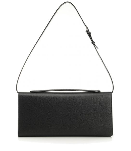 • Description : Clutch, chain strap, grained leather, flap closure, zippered interior pocket, interior patch pockets, gold finish.