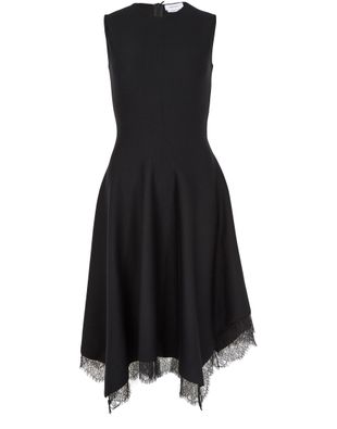 Introducing Alexander McQueen's lace asymmetric dress, a masterpiece that redefines elegance. This slim fit, knee-length dress features a round neck and sleeveless design, offering a perfect blend of modern style and comfort. The back zipper closure and exquisite lace details make it ideal for sophisticated occasions.