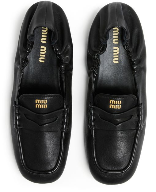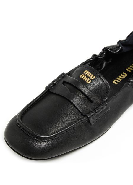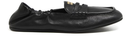 Reveal Miu Miu's leather loafers, crafted from smooth leather with a modern square toe and closed design. The elasticated sides ensure a comfortable fit, while visible stitching and the signature logo on the tongue add a refined touch. Flat heels complete this sleek, contemporary pair.