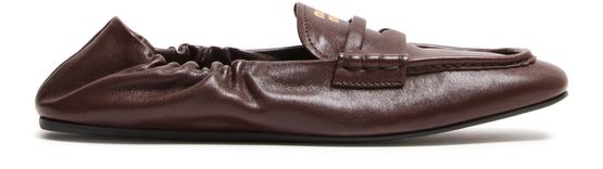 Reveal Miu Miu's leather loafers, crafted from smooth leather with a modern square toe and closed design. The elasticated sides ensure a comfortable fit, while visible stitching and the signature logo on the tongue add a refined touch. Flat heels complete this sleek, contemporary pair.