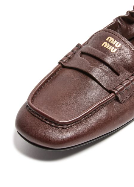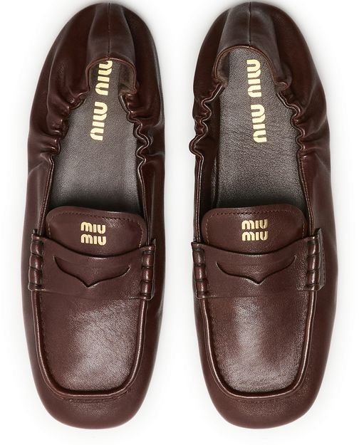 • Description : Printed "Miu Miu" lettering, loafers, logo on the tongue, smooth leather, flat heel, square toe, elasticated sides, visible stitching.