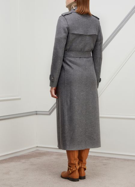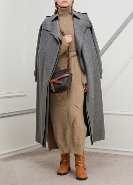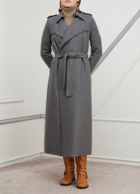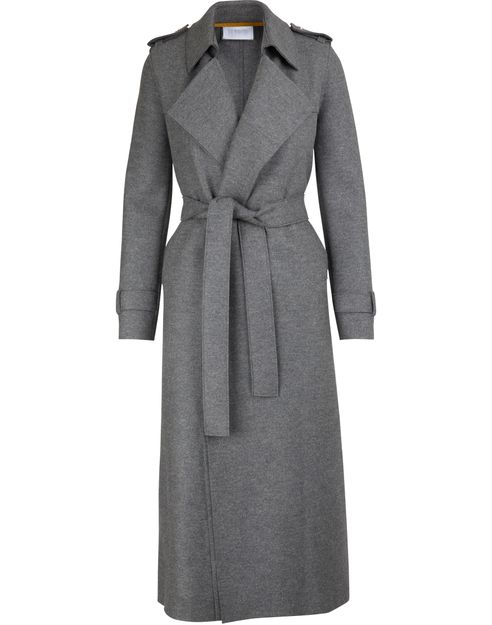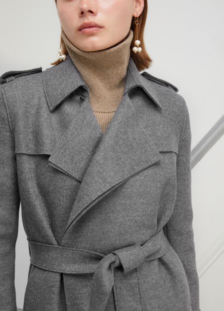 The London-based brand Harris Wharf is offering wool pieces bursting with character like this virgin wool coat. Our favorite part is the model's elegant detailing like the adjustable tabs at the cuffs and shoulders and the architectural notched collar. Tie the coat's belt to get a very feminine figure.