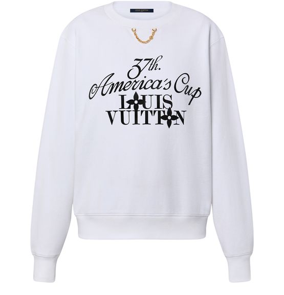 This staple sweater is cut from cotton jersey for relaxed daily styling. The chest is detailed with a cursive “37th America’s Cup” print from the LV x America's Cup 2024 capsule, which sits above a bold Louis Vuitton signature accented with Monogram Flowers. An LV chain embellishment adds a final House touch to the crew neckline.