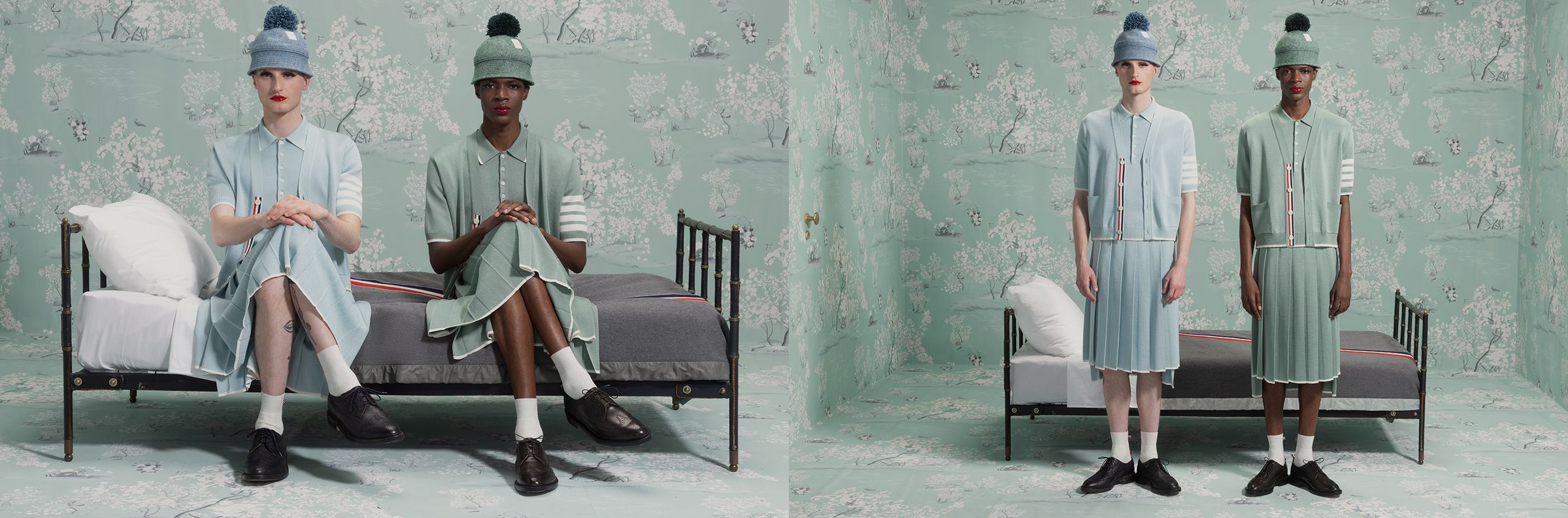 Thom Browne is the story of an American designer with a passion for tailoring who opened his small suit shop in 2001 in New York. In twenty years, the king of chic suits has brought the grey uniform up to date and slips a subtle extravagance into the elegance of his cuts. His surprising sensitivity and overflowing inspiration give personality to the fabric, erasing genres to enhance the garment in its purest form. The tailor's out-of-the-ordinary imagination delicately subverts the classic men's wardrobe. The Thom Browne men's collection is eccentrically elegant. In the men's ready-to-wear line, classic pieces are reinvented according to volumes, proportions and superimpositions, but always using simple colours and traditional fabrics. A dolphin brightens up a pair of chino pants, a hood hugs the lines of a blazer, a slightly undersized cut reinvents pinch pants. The famous red-white-blue grosgrain delicately adorns accessories and shoes. In our Thom Browne selection for men, a fantasy world inhabits the refined creations of the American tailor.