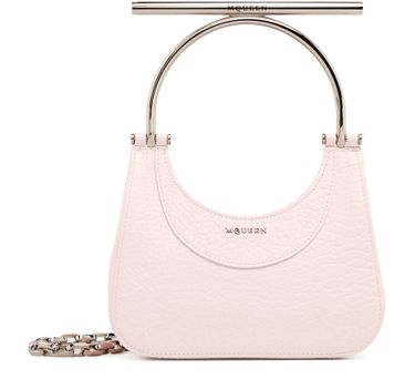 McQueen's mini T-Bar bag exudes sophistication with its magnetic closure and silver finish. Hand carried by a single handle, it showcases a front logo in silver letters. The interior pocket adds practicality, while visible topstitching and a thin strap enhance its refined design, making it a must-have accessory.