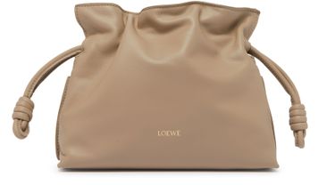 Loewe's Mini Flamenco clutch features a front logo in silver letters and a drawstring closure. It can be hand carried with its thin strap or worn on the shoulder or crossbody with the detachable strap. This versatile bag is perfect for adding a touch of elegance to any outfit.
