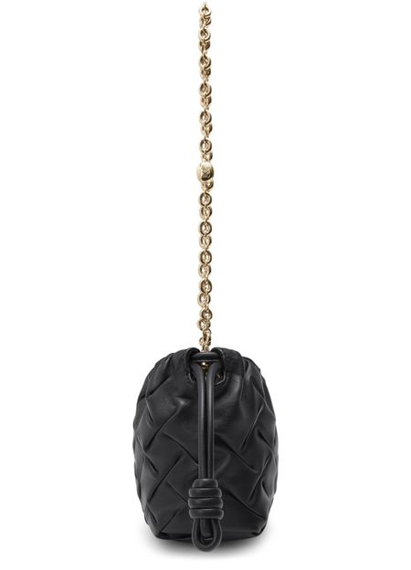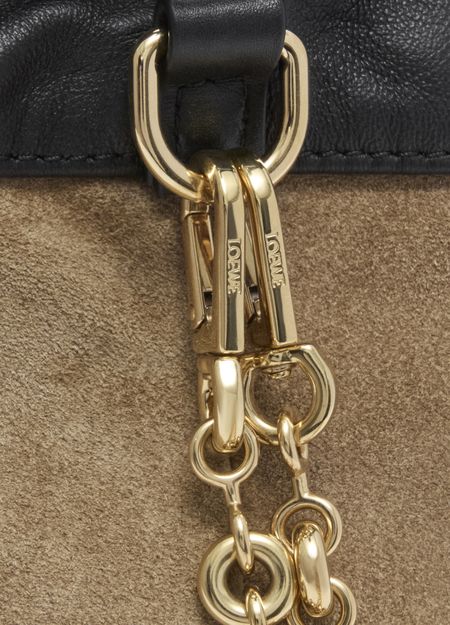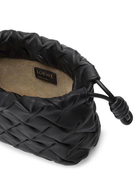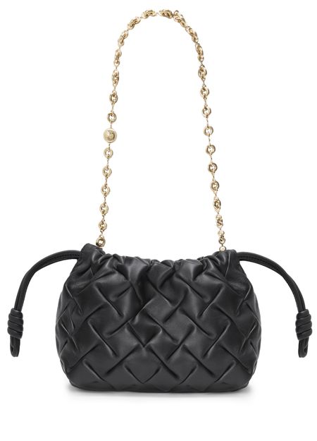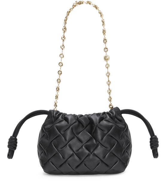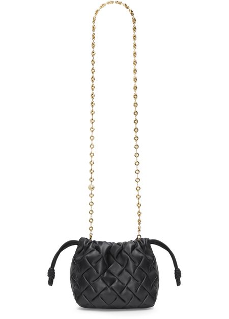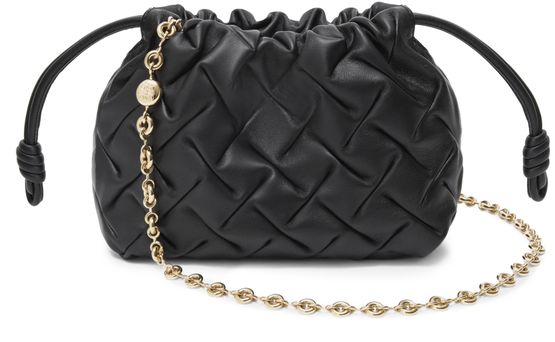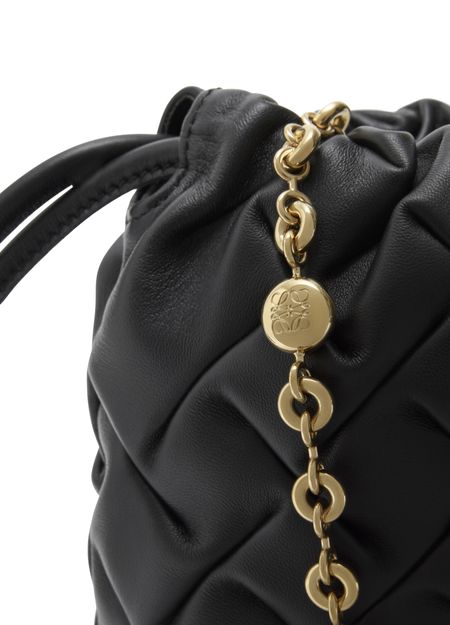 Reveal Loewe's mini flamenco purse in pinched nappa calfskin, a statement piece defined by smooth leather and geometric details. The gold-finish chain strap and drawstring closure blend modern artistry with practical design, while the padded texture adds a refined, tactile dimension to this small bucket bag.
