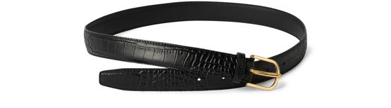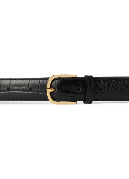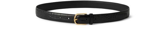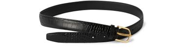 Reveal Toteme narrow crocodile-embossed trouser belt, crafted from crocodile embossed leather with a refined gold-tone hardware finish. The adjustable clasp ensures a perfect fit, while its waist-worn design adds a sophisticated accent to any ensemble, seamlessly blending versatility and modern appeal.
