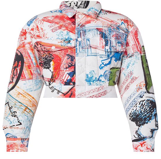 Key codes from the runway elevate a casual cropped jacket into an everyday statement. Cut from cotton poplin in a vibrant travel stamp print that combines Ancient Greek and Roman references from the Fornasetti collaboration. Light padding introduces unexpected volume and seasonal warmth, while a rubber Vuitton tab on the back signs the look with a contemporary signature.