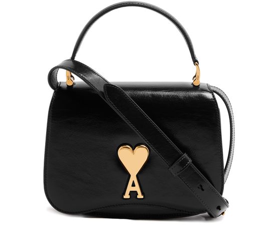 Ami's Paris top handle bag showcases a chic mini design with a flap closure and magnetic closure for secure storage. Its double handles offer a stylish hand-carried option, while the detachable strap allows for a crossbody look. A metallic logo on the front and visible topstitching add a touch of elegance.