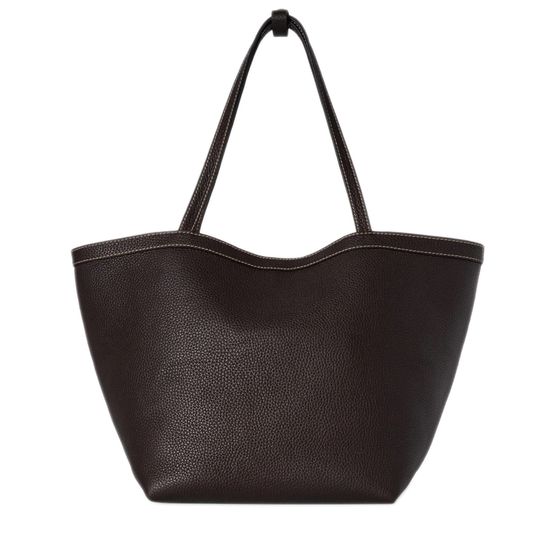 Introducing The Row's Park Tote Three Stitch bag, a masterpiece of modern design. Crafted from grained leather, this tote features double handles and a detachable interior purse. The visible stitching and padded texture add a touch of sophistication, making it a must-have for any fashion-forward wardrobe.