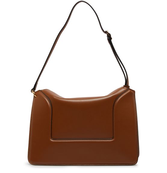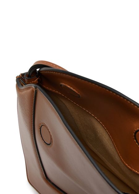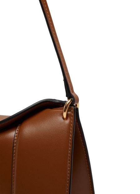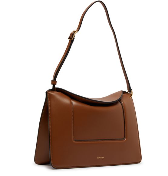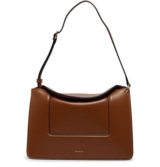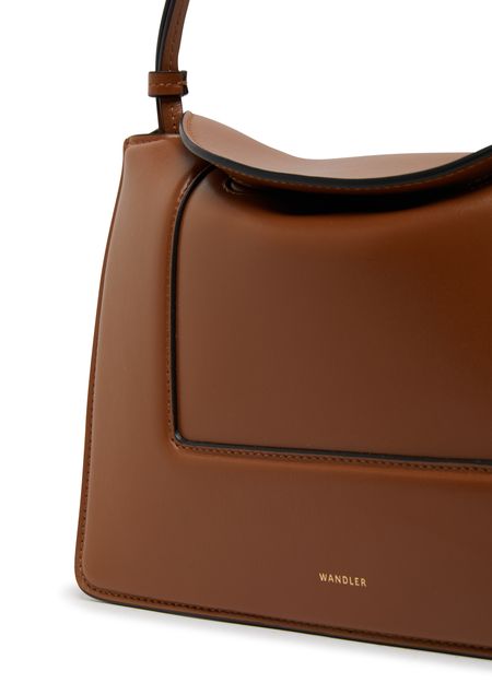 Wandler's Penelope bag showcases a sleek silhouette with a thin adjustable strap for versatile styling. Its visible stitching adds a touch of craftsmanship, while the flap closure ensures security. The front logo in gold letters elevates its elegance, making it a perfect companion for both casual outings and sophisticated events.