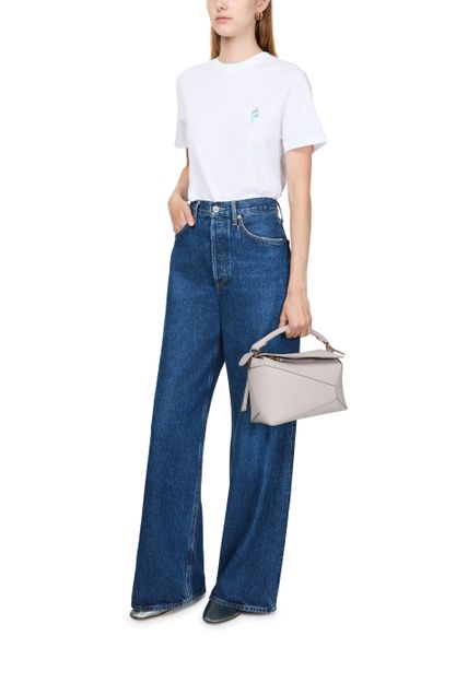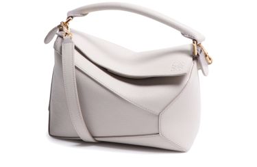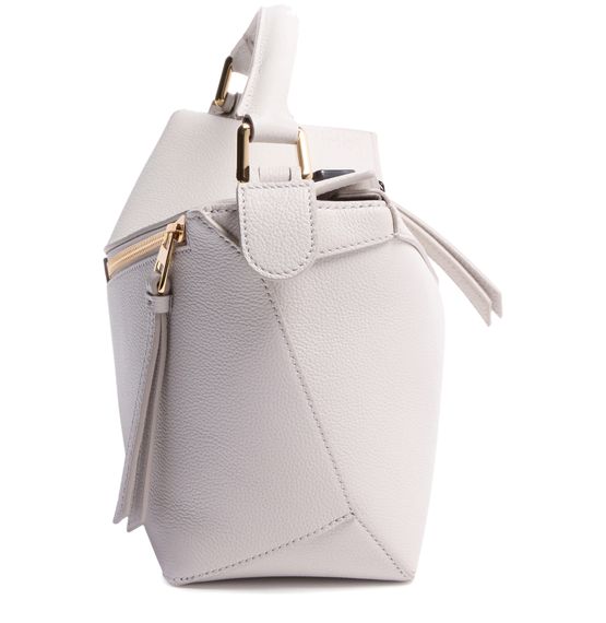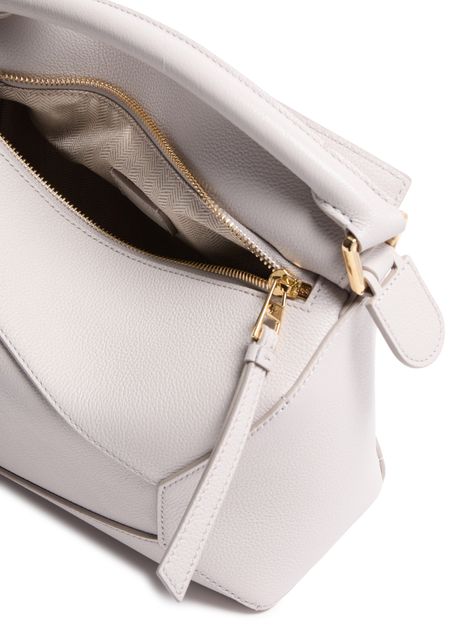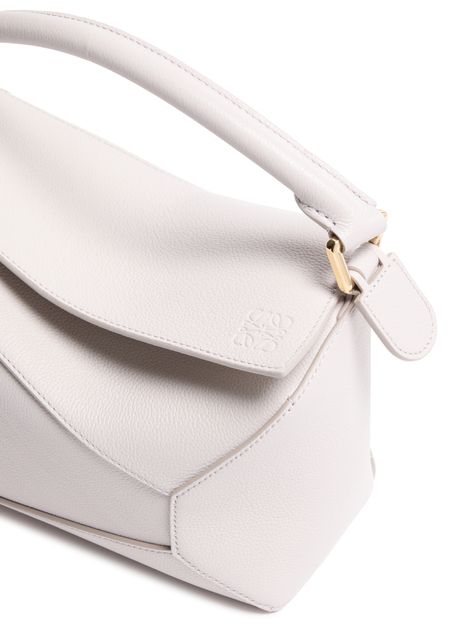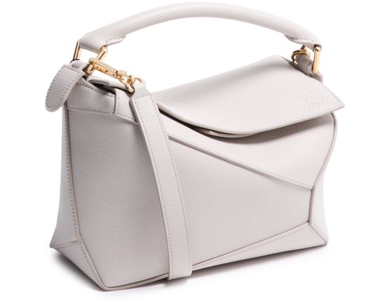 Reveal Loewe's Puzzle Edge small bag, crafted from grained leather with a single handle and metallic finish. Visible stitching and a refined flap closure highlight the brand’s signature craftsmanship, while the compact silhouette offers a modern, versatile accessory for any occasion.
