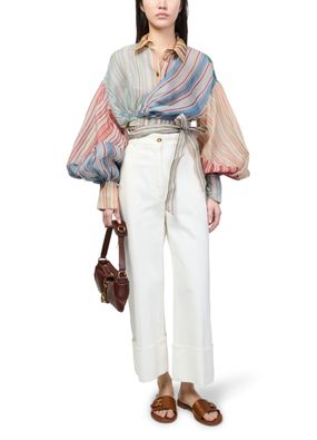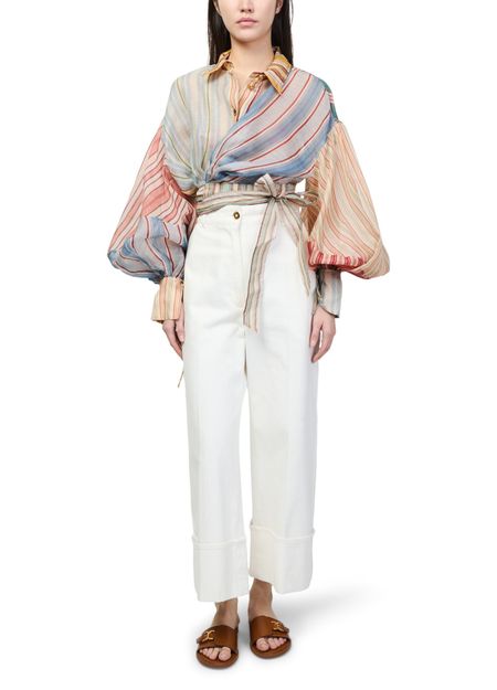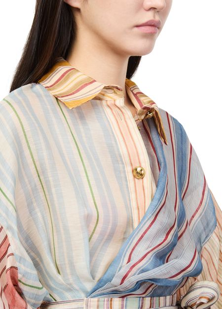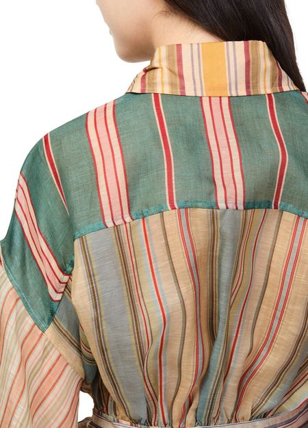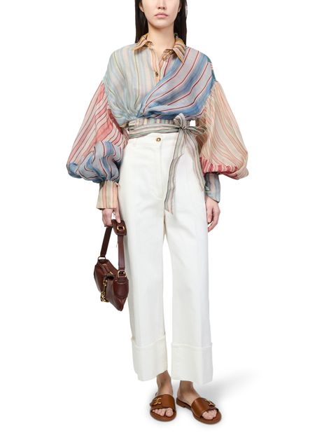 Reveal Zimmermann's Rebellion striped blouse, a modern top featuring gigot sleeves and a belted waist for a refined silhouette. The multicolor striped print and button closure with bow detail add a playful twist, making it a standout piece for both casual and elevated ensembles.