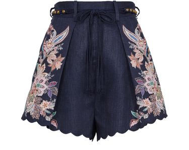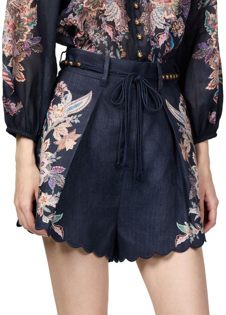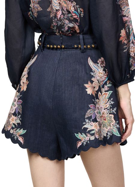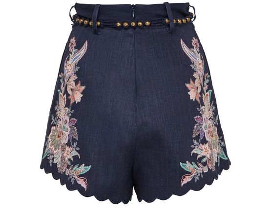 • Description : floral embroidery, concealed back zipper closure, visible stitching, scalloped edges, belt loops, short length.