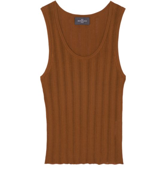 Reveal Bompard's ribbed vest top, designed with a round neck for a refined silhouette. The soft ribbed texture adds dimension, while its versatile cut pairs effortlessly with tailored pants or relaxed denim. Perfect for layering or wearing solo, this top brings understated sophistication to any look.