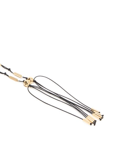 Reveal Isabel Marant's scarf necklace, a modern statement piece featuring bead and pearl details. The gold finish adds a radiant touch, while the sliding closure ensures effortless wear. This necklace seamlessly blends sophistication and versatility, making it a standout addition to any contemporary jewelry collection.