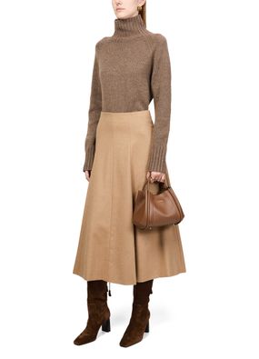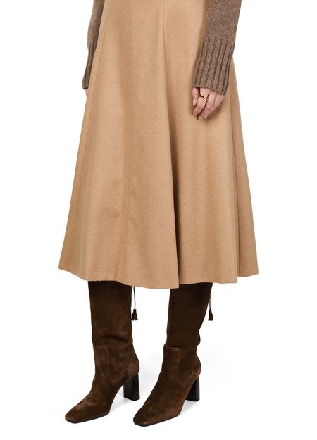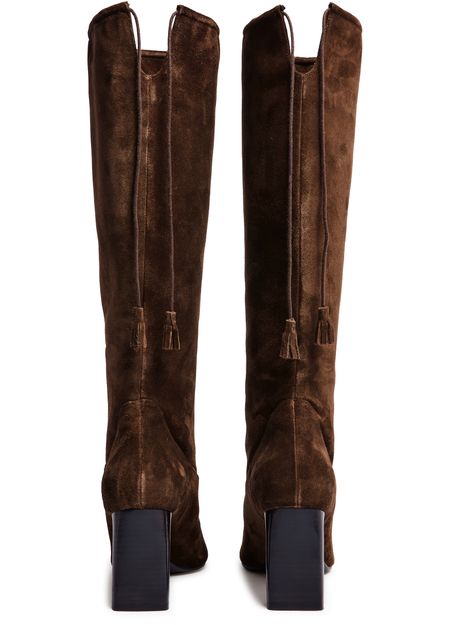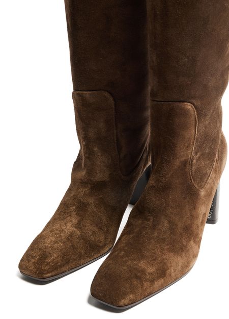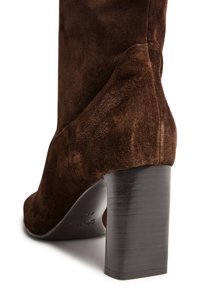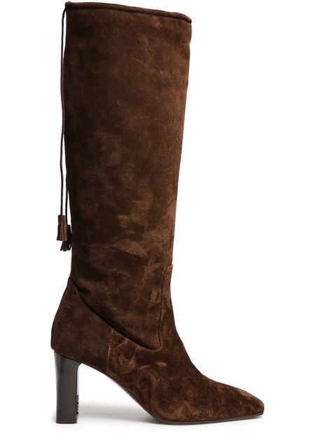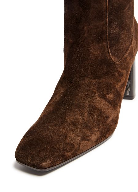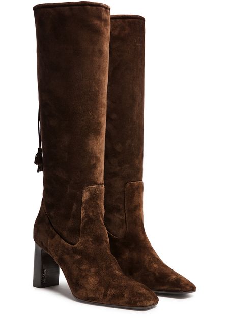 Reveal Max Mara's slouchy boots, crafted from luxurious suede. These high block heel boots feature a chic square toe and closed design, enhanced by visible stitching and tassel details. The engraved logo adds a touch of sophistication, making them a standout addition to any wardrobe.