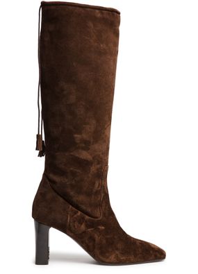 Reveal Max Mara's slouchy boots, crafted from luxurious suede. These high block heel boots feature a chic square toe and closed design, enhanced by visible stitching and tassel details. The engraved logo adds a touch of sophistication, making them a standout addition to any wardrobe.
