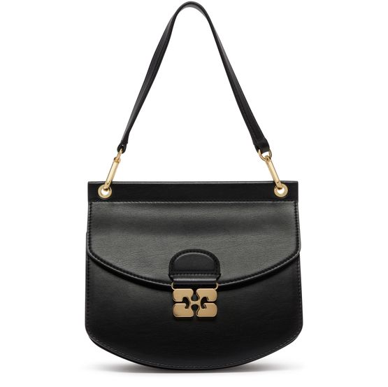 Ganni's Small Apo-G bag showcases a chic mini design with a stylish flap closure and a prominent front logo. Its single handle and thin detachable strap allow for versatile wear, whether carried or worn on the shoulder. Visible topstitching adds a refined touch, making it a perfect accessory for any outfit.