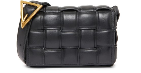 Bottega Veneta's Small Padded Cassette bag is crafted from smooth leather and features the brand's signature Intrecciato weaving. It is designed with a shoulder strap adorned with a triangular buckle and a flap closure. This versatile bag can be worn on the shoulder or crossbody, making it a sleek and functional accessory.