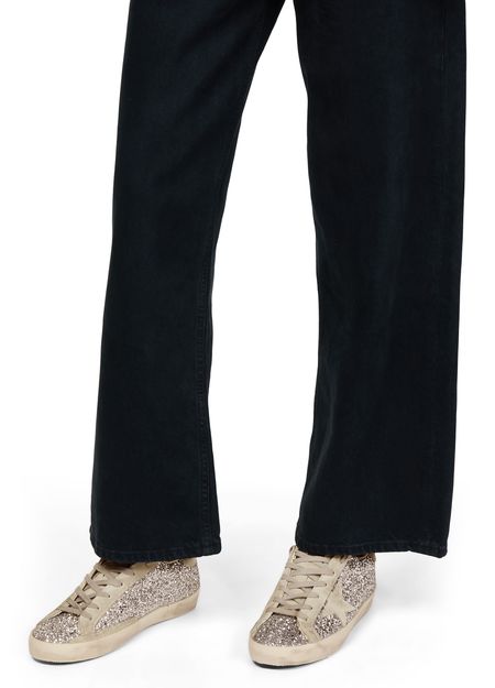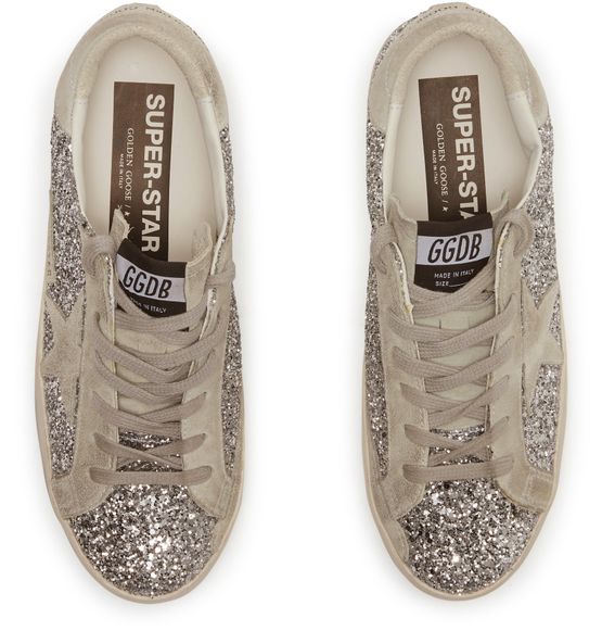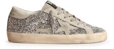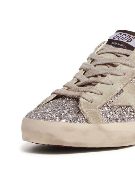 Unveil Golden Goose's Super-Star in silver glitter with suede star. These sneakers feature a closed round toe and a flat heel, offering both style and comfort. The lace and strap closure ensures a secure fit, while the logo-printed insole and visible stitching add a touch of sophistication.