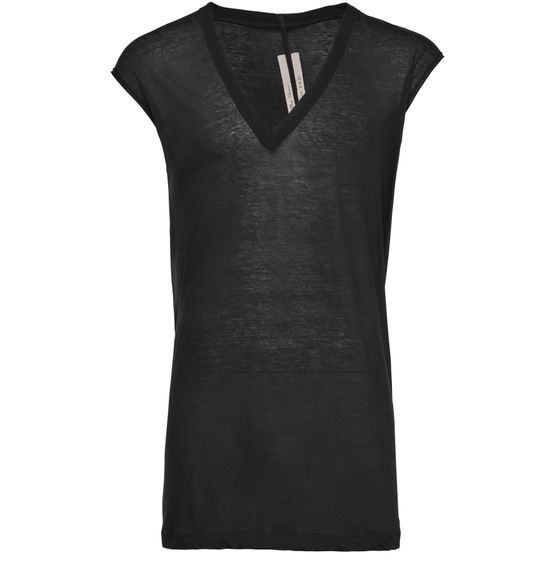 Rick Owens's T-shirt showcases a sleeveless tank top design with a stylish v-neck. Its distinctive appliquéd logo adds a touch of modern flair, while the visible stitching emphasizes the craftsmanship. Perfect for layering or wearing solo, this piece embodies a bold, avant-garde aesthetic that redefines contemporary fashion.