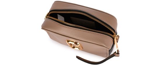 • Description : Mini bag, slender, adjustable, detachable strap, grained leather, metal logo on the front, worn on the shoulder or crossbody, zipper fastening, gold finishes.