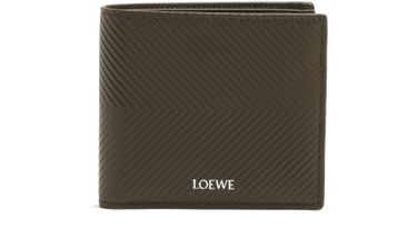 Loewe's Two-compartment wallet in supple grained calf leather showcases a sleek design with a front logo in silver letters. Visible topstitching adds a touch of sophistication, while the expertly crafted interior slots for cards offer both style and functionality, making it an essential accessory for the modern individual.