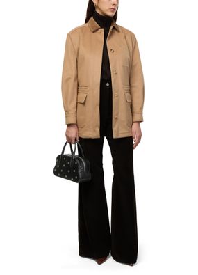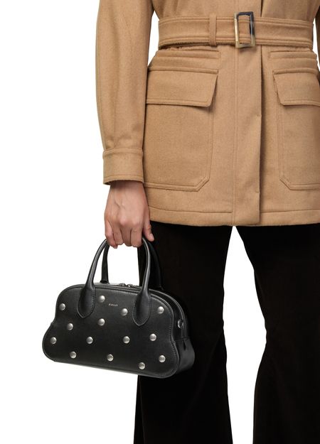Reveal Bally's Unda Satchel handbag, a masterpiece of smooth leather craftsmanship. This shoulder bag features a sleek design with double handles and an adjustable thin strap for versatile wear. The front logo and silver finish add a touch of elegance, while the zipper closure ensures your essentials are secure.