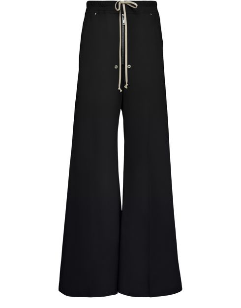 Rick Owens's Wide bela pants offer a high-waisted fit with an elasticated drawstring waist for ultimate comfort. Featuring a wide cut and ankle length, these casual pants include visible stitching, side pockets, flap pockets, and a back pocket. The zipper closure and drawstring hem add a stylish touch to any outfit.