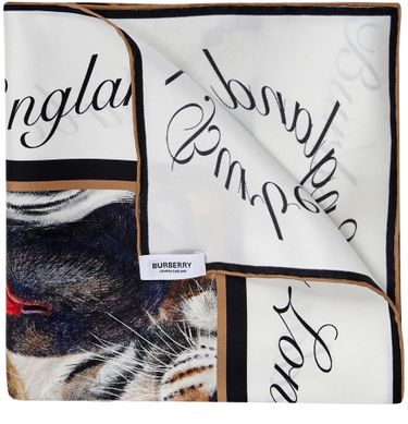Featuring asymmetrical animal print, and dominated by a zebra in its center, this elegant Zebra-print square in 100% Mulberry silk has been designed with women in mind. The Burberry London England brand is inscribed in black around the edge of the square, within a white border.