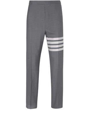 The 4-Bar pure wool trousers are enhanced by four horizontal stripes on the thigh. A unique piece with ankle cuffs from Thom Browne.