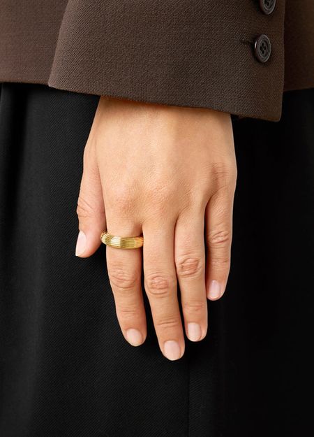 Reveal Lie Studio's Amelia ring, a timeless piece with a radiant gold finish and an engraved logo. This elegant accessory effortlessly elevates any look, making it a refined choice for those who appreciate enduring style and subtle sophistication.