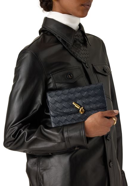 Reveal Bottega Veneta's Andiamo clutch on chain, a testament to refined artistry. Crafted from smooth leather with the signature Intrecciato weaving, it features a detachable chain strap, twist lock closure, and interior card slots. The embossed logo and metal finish add a polished touch to this versatile accessory.