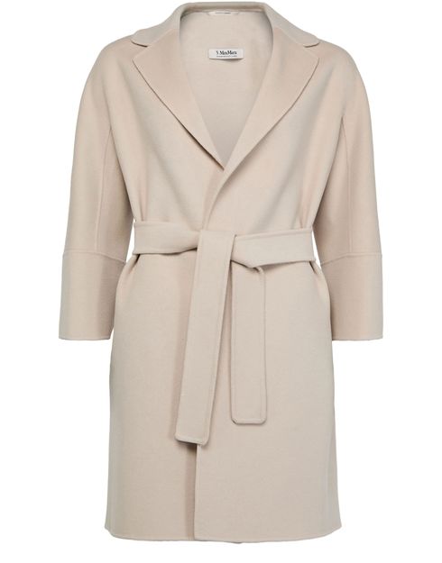 S Max Mara's Arona belted coat showcases a sophisticated silhouette with a notched collar and a stylish belt that cinches the waist. Its short, long-sleeved design combines elegance and practicality, making it perfect for transitional seasons. Embrace timeless fashion while staying warm and chic in this exquisite piece.