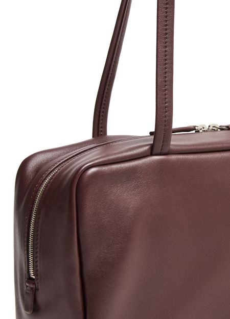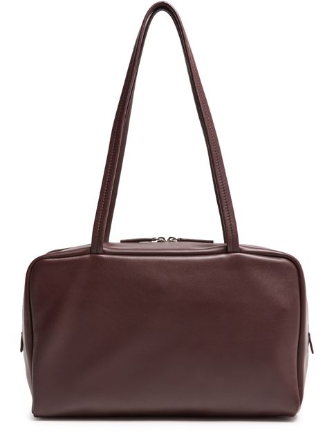 Reveal The Row's Astra bowling bag, crafted from smooth leather with double handles and a thin strap for versatile carrying. Visible stitching and a spacious interior with an open pocket add refined detail, while the zipper closure and leather lining ensure both security and sophistication.