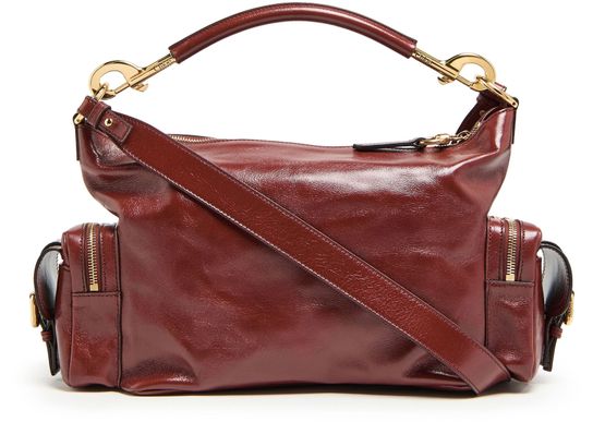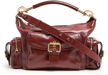 Chloé's Camera bag showcases a sleek design with a zipper closure and a single compartment for essentials. Its gold finish adds a touch of elegance, complemented by double handles and visible topstitching. With interior patch pockets, it can be hand carried or worn crossbody using the detachable thin strap.
