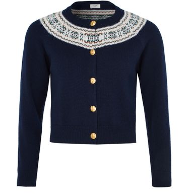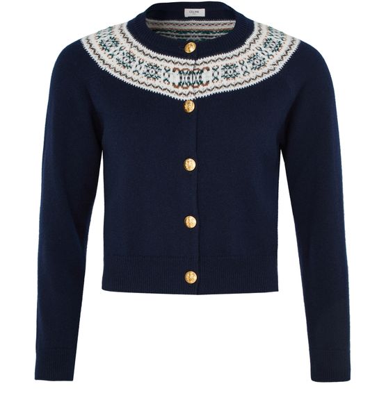 Discover Celine's Cardigan in fair isle cashmere with a front buttoned closure that adds a touch of sophistication. The appliquéd logo subtly stands out while the long-sleeved, crew neck design ensures warmth and elegance. Regular length and cuffed sleeves provide a timeless and versatile look.