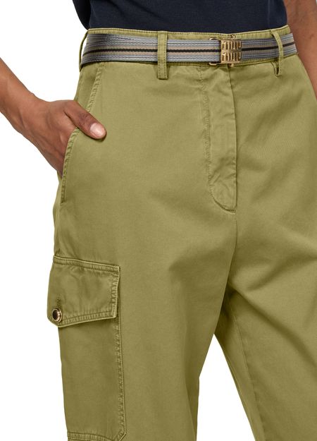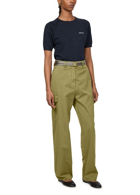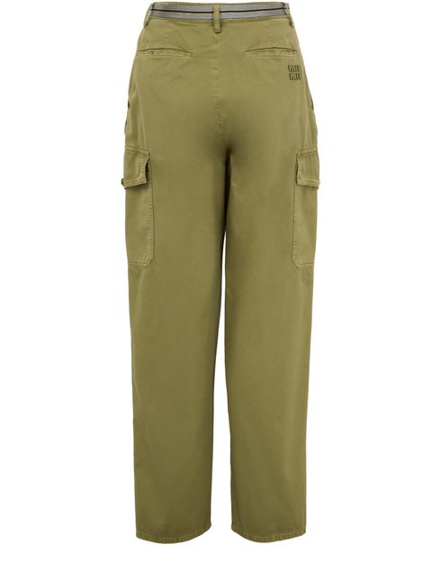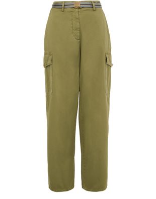Miu Miu's Cargo pants offer a stylish blend of functionality and fashion. With a buttoned and concealed zipper closure, these ankle-length trousers feature a belted waist and a loose fit. Flap pockets, side pockets, and a back pocket provide ample storage, while visible stitching and a logo at the back enhance their appeal.