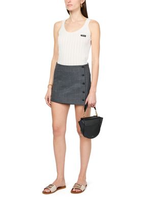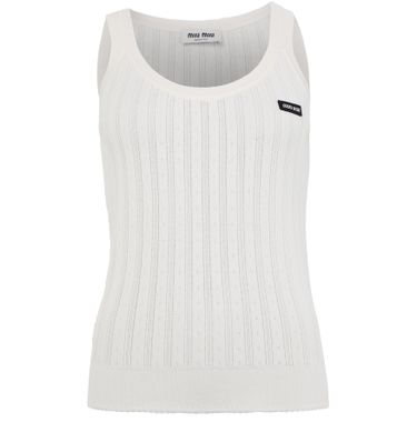 Miu Miu's Cashmere and silk vest top showcases a regular length with a round neck, perfect for layering. Its sleeveless design offers effortless elegance, while the distinctive chest logo adds a touch of sophistication. Ideal for both casual outings and refined occasions, this piece effortlessly elevates your wardrobe essentials.