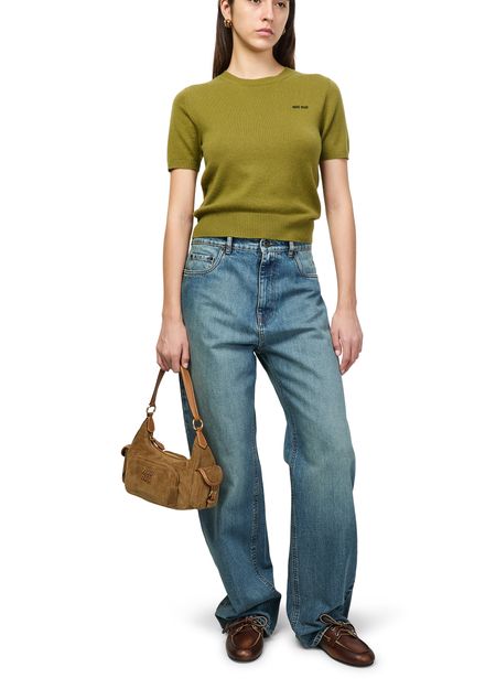 Reveal Miu Miu's cashmere t-shirt, featuring a refined crew neck and short sleeves for a modern silhouette. The embroidered "Miu Miu" logo on the chest adds a signature touch, making this top a versatile choice for both casual and elevated ensembles.