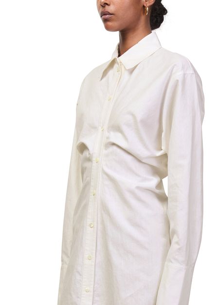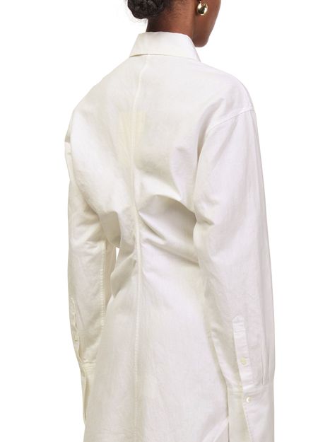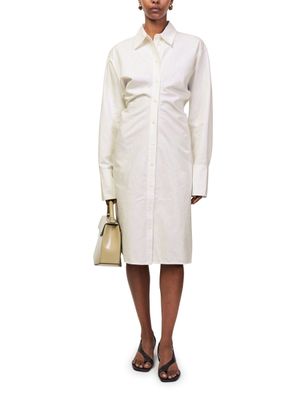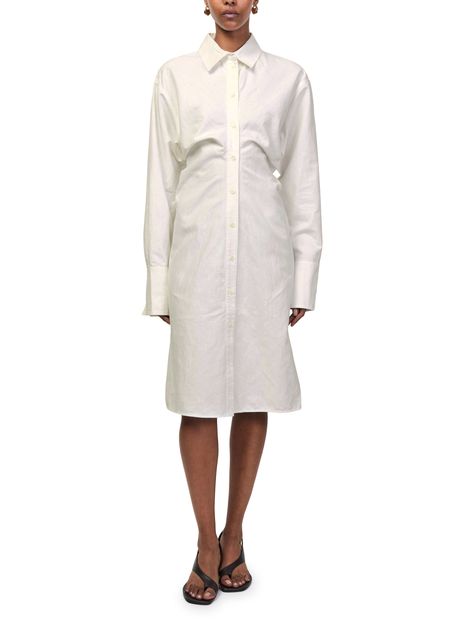 Reveal Toteme's casual cotton shirt dress, a knee-length silhouette with a tailored collar and dropped long sleeves. The front buttoned closure and soft cotton fabric offer effortless sophistication, making this shirt dress a versatile choice for both relaxed and refined occasions.