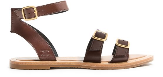 Elevate Celine's Lympia triple strap sandals in calfskin with buckled ankle strap and visible stitching. Featuring an engraved logo, gold finish, and logo-printed insole, these sandals boast a low heel and open round toe for a stylish look.