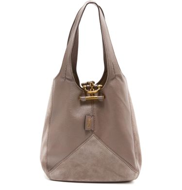 Reveal Chloé's Balloon shoulder bag, crafted in bi-material with double handles for versatile wear. The front logo in gold letters and visible topstitching highlight refined details, while the gold finish adds a sophisticated touch. This piece seamlessly blends modern design with timeless elegance.
